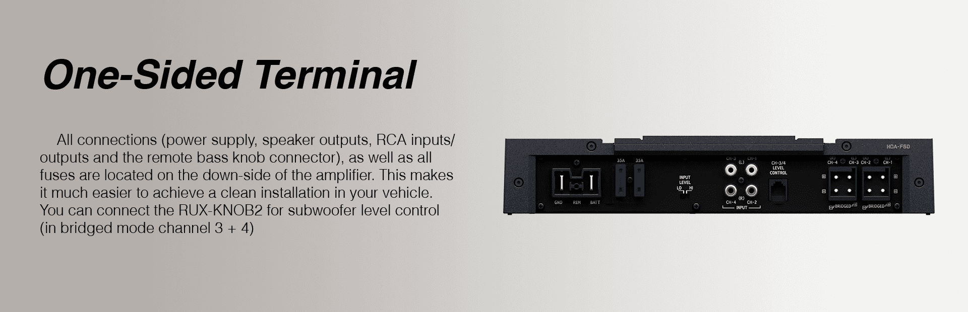 The HDA-F60 Hi-Res Audio certified 4 channel amplifier redefines the industry benchmark in sound performance, delivering true high-resolution sound reproduction. The all-new digital design provides huge amounts of power output and an extraordinary damping factor making these amplifiers class-leading in every way. With performance at the highest standard, the HDA-F60 has a frequency response of 10-60kHz and a >500 dampening factor to deliver high power output with precision, as well as a superlative high-definition sound experience.